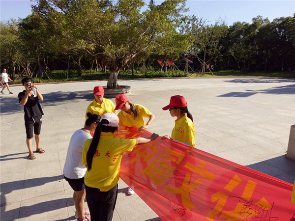 7月12日下午,sjb世俱杯官方网站“魅力凤里”赴石狮市永宁古镇暑假实践队在万寿塔下进行横幅签名,以及分发调查问卷。