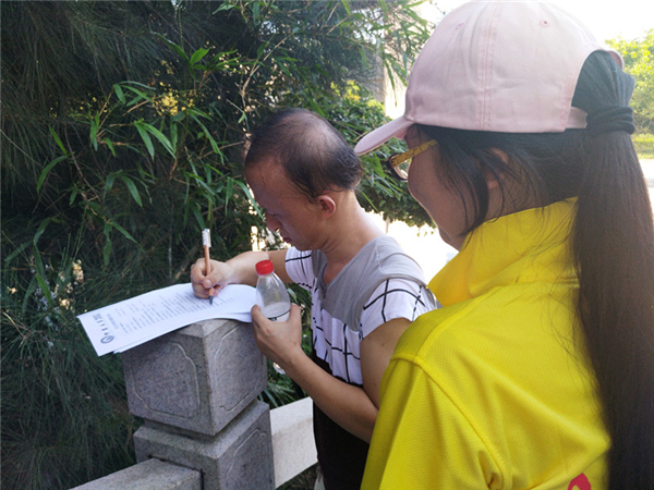 实践队员将问卷调查分发给游客,向他们解释问卷的内容,还与游客一起交流关于保护文物的问题等。整个过程中,游客十分热情地响应我们的号召,积极配合参加我们的活动,并提出一些关于保护万寿塔的建议。活动最后,实践队邀请游客在横幅上签名,表明了对保护万寿塔的坚定。