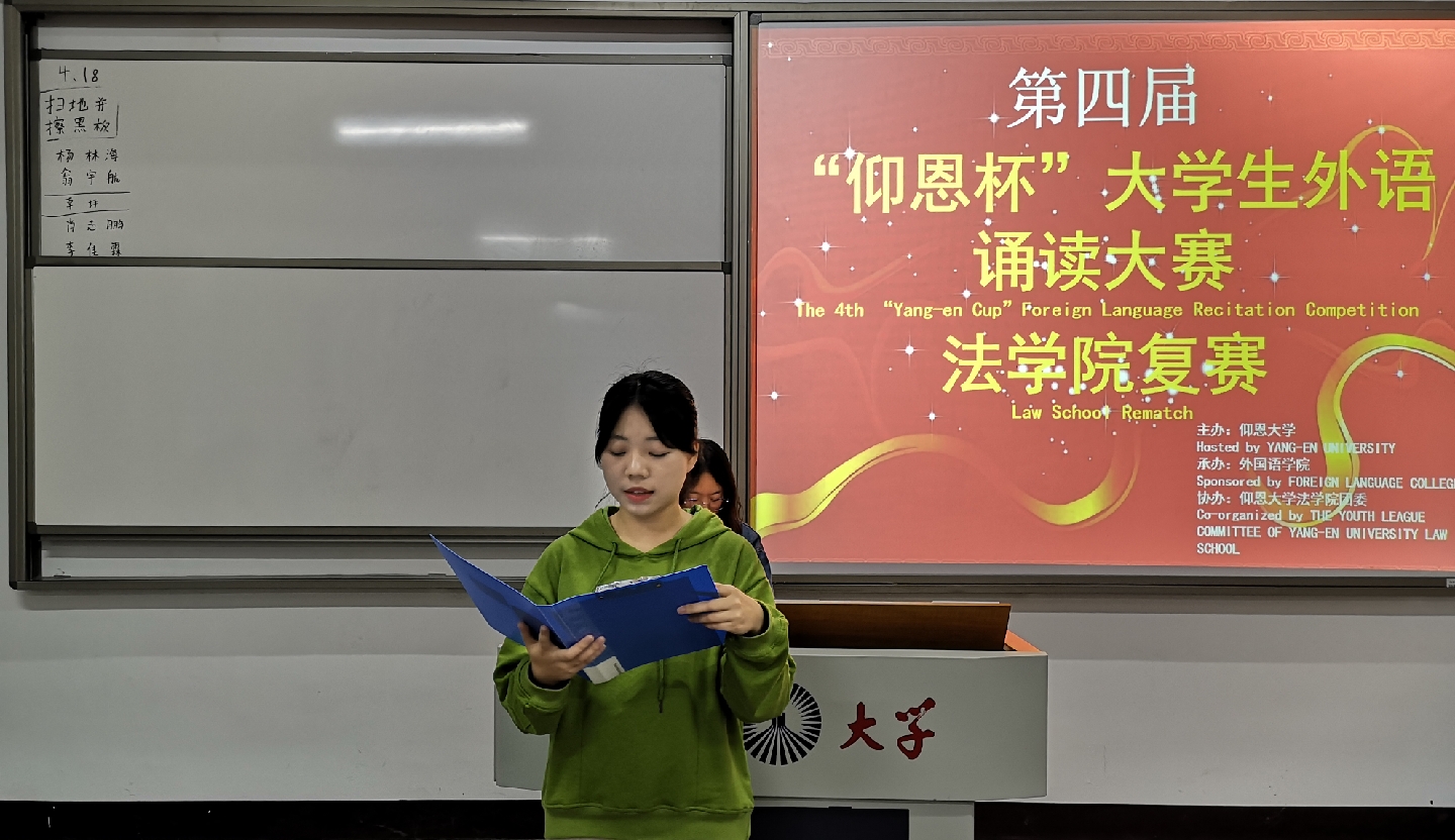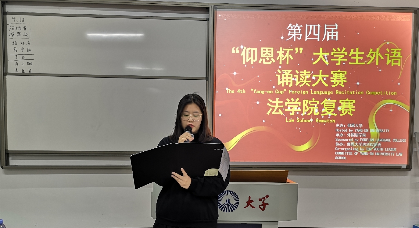 4月18日晚,由仰恩大学主办,外国语学院承办,sjb世俱杯官方网站团委协办的第四届“仰恩杯”大学生外语诵读大赛sjb世俱杯官方网站复赛于仰恩大学第三教学区普照楼204举行。外国语学院老师陈苗苗,梁正长担任本次比赛评委,sjb世俱杯官方网站17级、18级学生参加了此次活动。