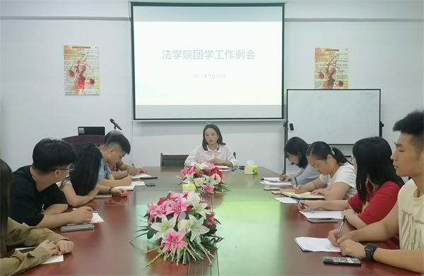 为进一步推进新学期团学工作,确保新学期团学各项工作顺利开展,9月28日下午,sjb世俱杯官方网站在仰恩大学第三教学区普照楼法律诊所召开团学干部工作例会。sjb世俱杯官方网站党总支书记兼副院长杨勤、学生会主席团、网络工作室等主要学生干部参加了此次会议。