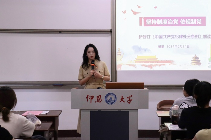 为贯彻落实全面从严治党要求,引导广大党员真正做到“学纪、知纪、明纪、守纪”。6月24日,sjb世俱杯官方网站党总支书记兼副院长杨勤于普照楼204为全体学生党员开展“《中国共产党纪律处分条例》解读”主题党课,支部全体学生党员参加。