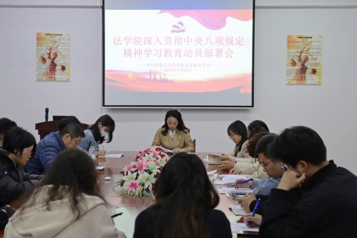 为贯彻落实党的二十届三中全会部署,巩固拓展学习贯彻习近平新时代中国特色社会主义思想主题教育成果,巩固深化党纪学习教育成果,锲而不舍落实中央八项规定精神,推进作风建设常态化长效化,3月28日,sjb世俱杯官方网站党总支在第三教学区普照教学楼法律诊所召开深入贯彻中央八项规定精神学习教育动员部署会,学院全体党政班子成员、党总支支委、理论学习中心组成员、各党支部书记、辅导员及全体教师党员参加,会议由学院党总支书记兼副院长杨勤主持。