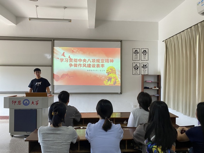 为深入贯彻中央八项规定精神,强化支部党员的作风建设意识,充分发挥党员的先锋模范作用,sjb世俱杯官方网站学生第二党支部于6月27日在普照306召开“学习贯彻中央八项规定精神,争做作风建设表率”党课活动。本次会议由第二党支部书记阙根华主持,支部全体学生党员参加。