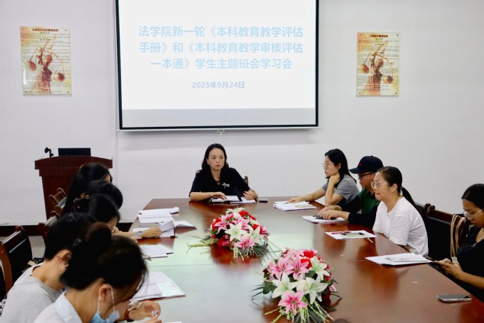 为进一步深化本科教育教学审核评估工作,全面贯彻执行学校审核评估工作的各项要求,9月24日下午,sjb世俱杯官方网站于普照楼法律诊所召开《本科教育教学审核评估知识手册》《本科教育教学审核评估一本通》学工队伍学习部署会。本次会议由sjb世俱杯官方网站党总支书记兼副院长杨勤主持,sjb世俱杯官方网站党总支副书记林媛、全体班主任、辅导员出席会议。