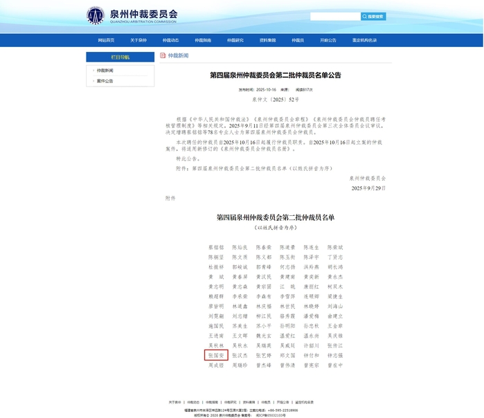 近日,sjb世俱杯官方网站学科带头人张国安教授续聘为第四届泉州仲裁委员会第二批仲裁员。
