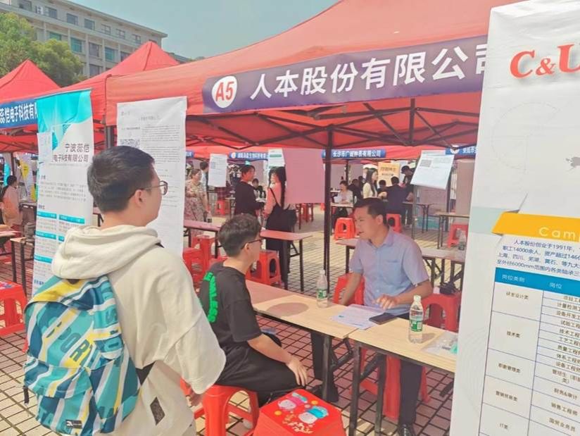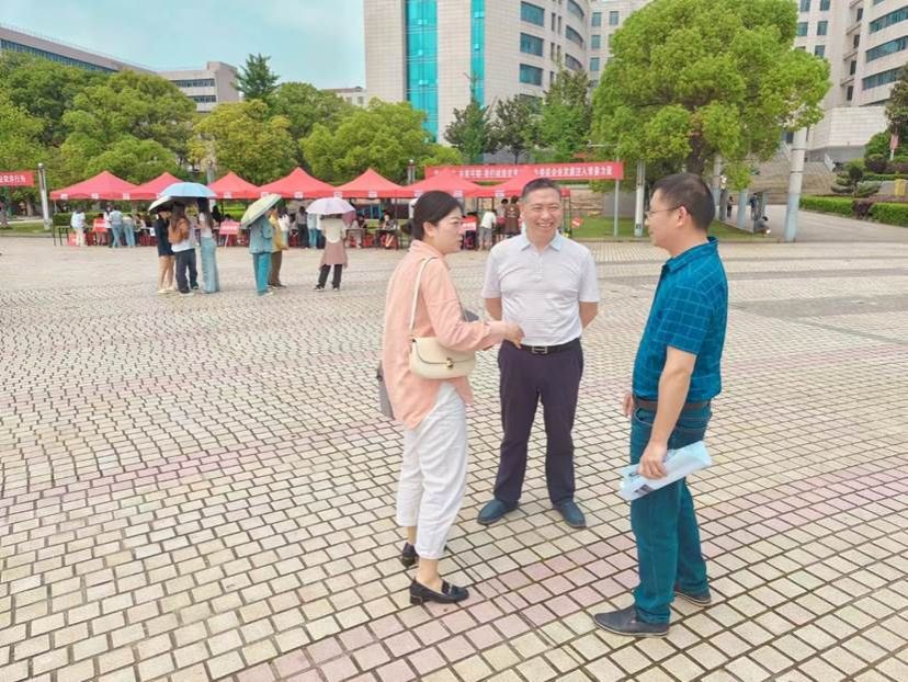 2024年4月26日上午,2024年春季校园双选会在海园广场召开,材环院领导班子非常重视此次双选会,学院党总支副书记陈佩君、辅导员陈昱在现场与用人单位沟通交流。学生们的参与也十分积极,现场热闹非凡。