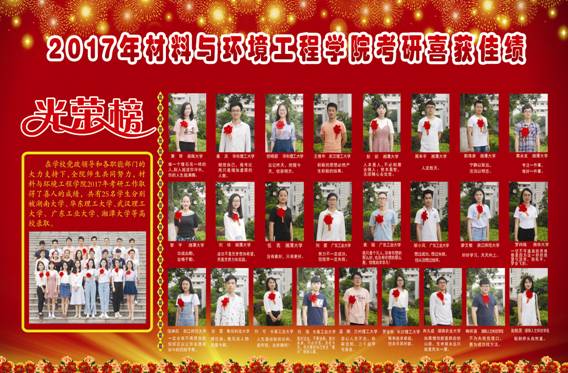 在学校党政领导和各职能部门的大力支持下,全院师生共同努力,材料与环境工程学院2017年考研工作取得了喜人的成绩,共有25名被湖南大学、华东理工大学、武汉理工大学、广东工业大学、湘潭大学等高校录取。
