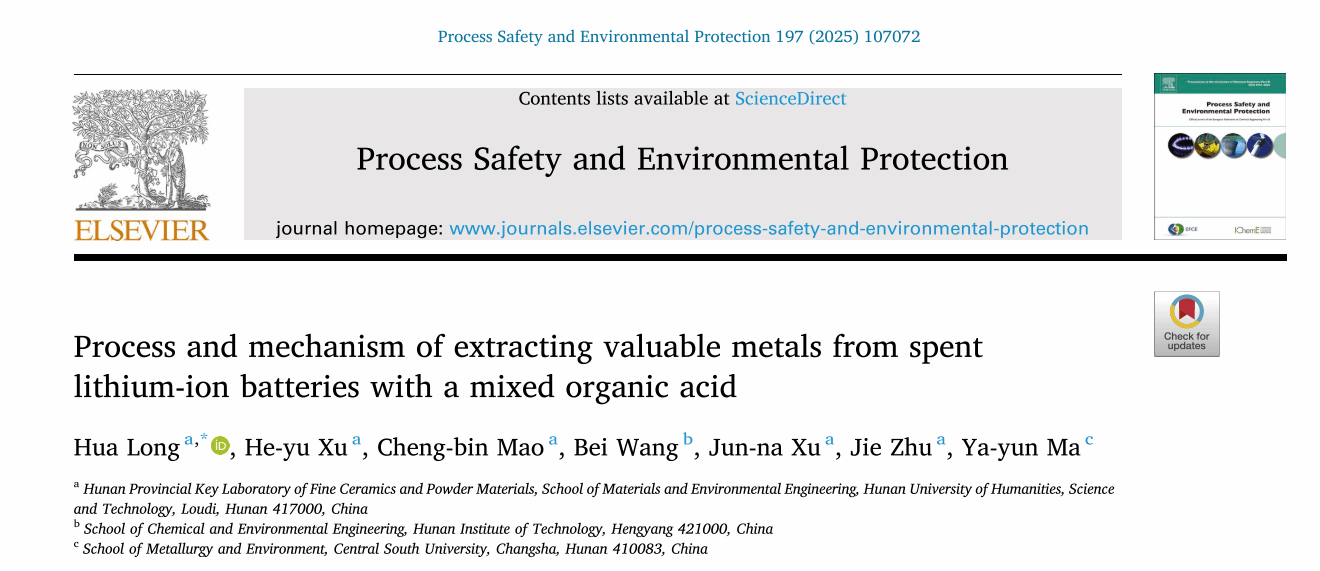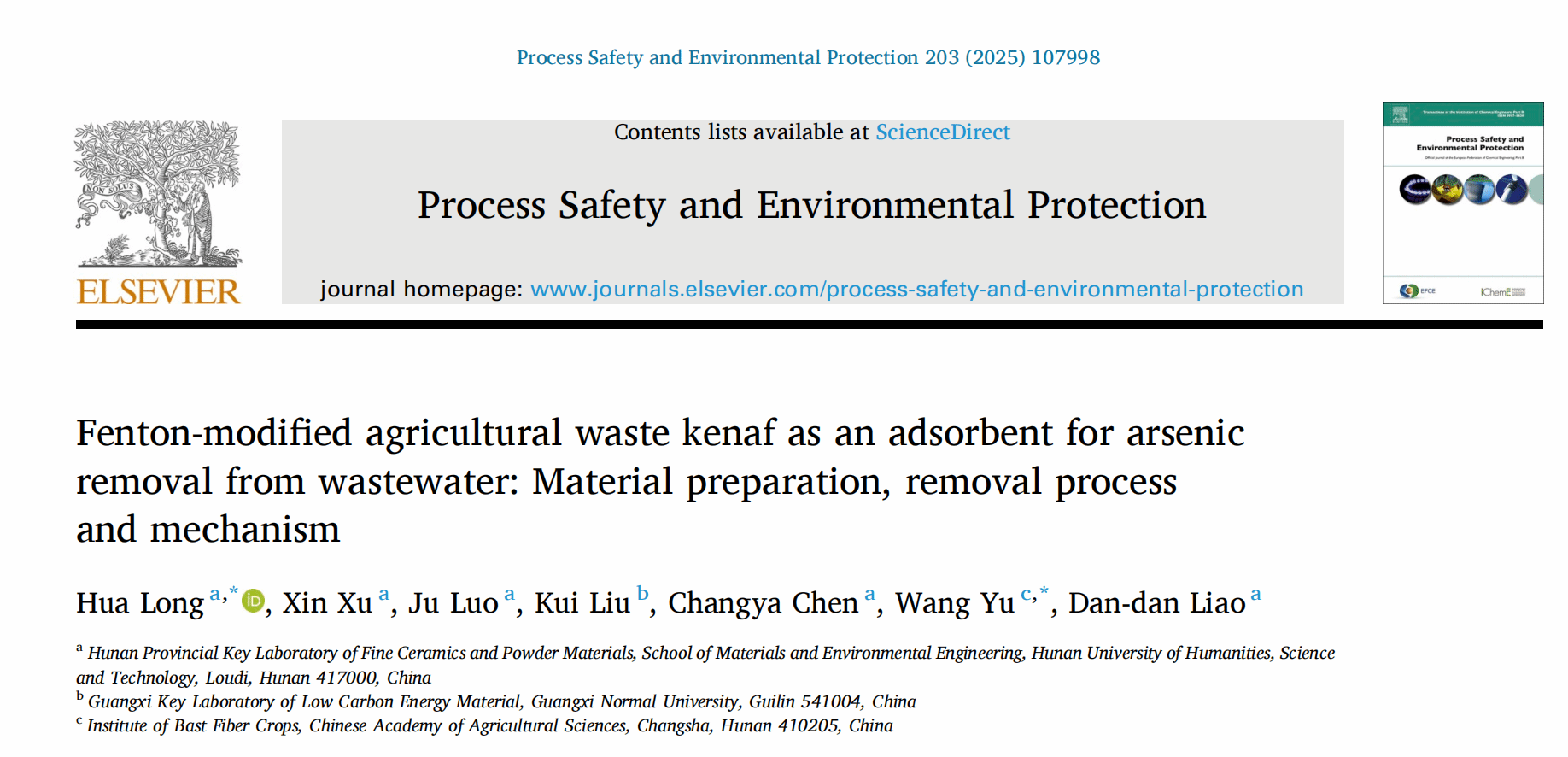 近日,材料与环境工程学院龙华博士团队在环境科学与生态学领域国际Top期刊《Process Safety and Environmental Protection》先后发表两篇重要研究论文,题目分别为“Process and mechanism of extracting valuable metals from spent lithium-ion batteries with a mixed organic acid”和“Fenton-modified agricultural waste kenaf as an adsorbent for arsenic removal from wastewater: Material preparation, removal process and mechanism”。beat365中文官方网站均为论文的第一完成单位。