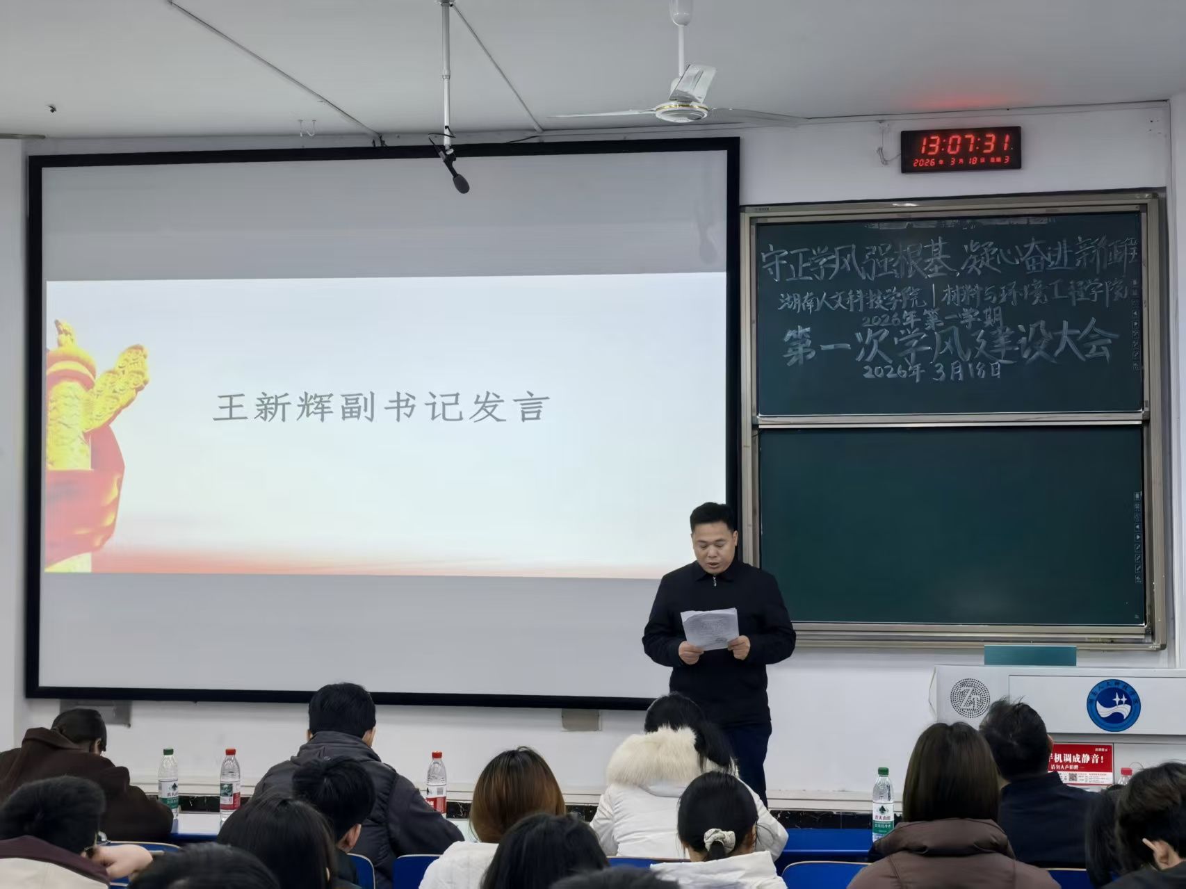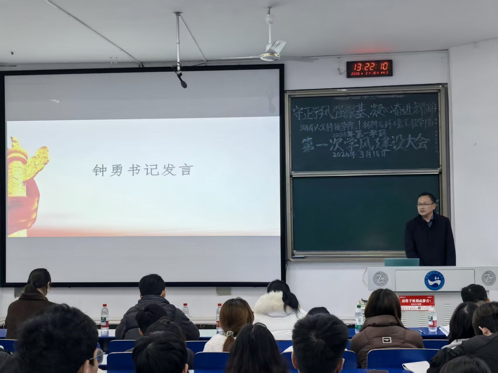 2026年3月18日中午,材料与环境工程学院于致远楼119教室召开2026年上学期第一次学风建设大会。学院党总支书记钟勇、副书记王新辉、全体政治辅导员老师及23-25级各班班委代表出席会议。