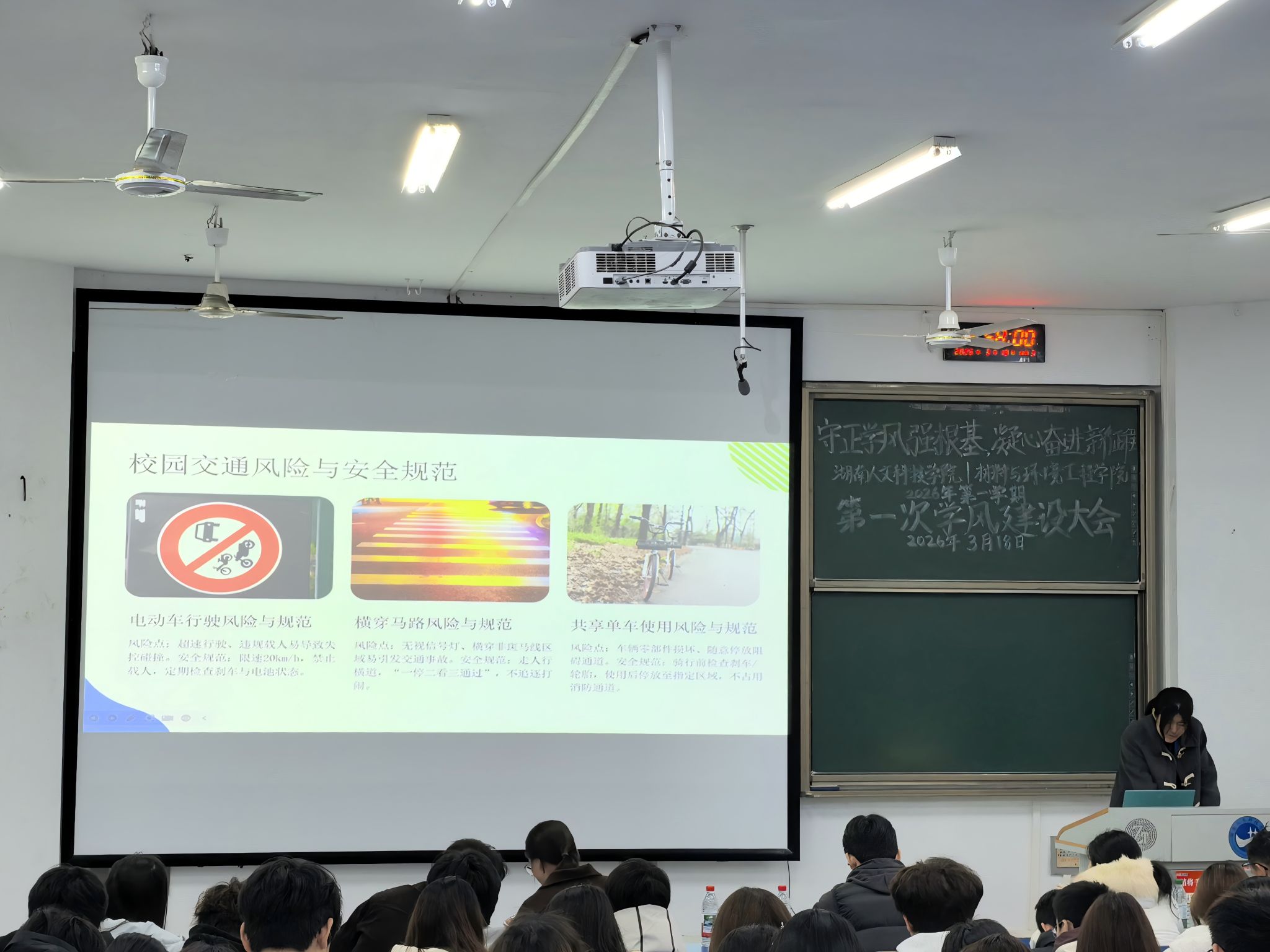 会议伊始,学习实践部主持人柏申晴子结合近期校园安全典型案例,围绕宿舍用电安全、消防安全、人身财产安全及网络安全等重点内容进行宣讲,提醒同学们严格遵守宿舍管理规定,严禁使用违规电器,熟悉消防逃生通道,提高防范意识,警惕电信网络诈骗,自觉规范网络行为,共同维护平安和谐的校园环境。随后,团学会学习实践部代表潘荣向全体同学发出学风建设倡议,号召大家:坚守专业初心,做志存高远的追梦人;严守纪律规矩,做自律自强的规矩人;深耕专业本领,做勤学善思的求真者;弘扬互助风尚,做协同共进的同行者;践行使命担当,做知行合一的实干家。
