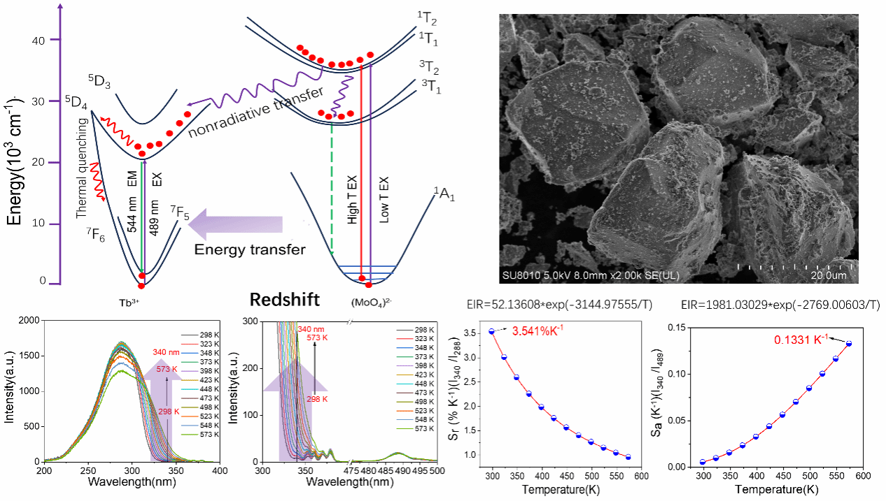 Thermometric properties of SrMoO4:Tb3+ phosphor based on redshift of charge transfer band edge图摘