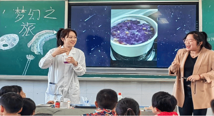 本次活动在李晶同志与娄底第一小学四年级(四)班主任的组织和领导下,旨在通过变色小实验,播下孩子们探索科学创新的种子。在课程开始前,李晶同志用扎实的学术功底、诙谐幽默的语言对课程内容进行介绍,并强调了实验过程中需要注意的方式方法和操作规范性,其余党员同志在下方起辅助讲解作用。
