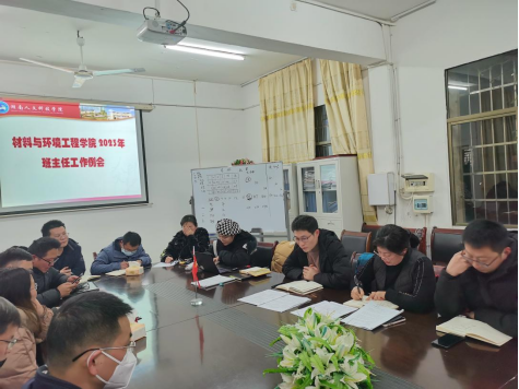 2023年2月12日晚上,材料与环境工程学院在多闻楼410召开了新学期班主任工作会议,党总支书记谭峰亮、党总支副书记陈佩君、全体班主任、全体辅导员参加会议。会议由陈佩君主持。
