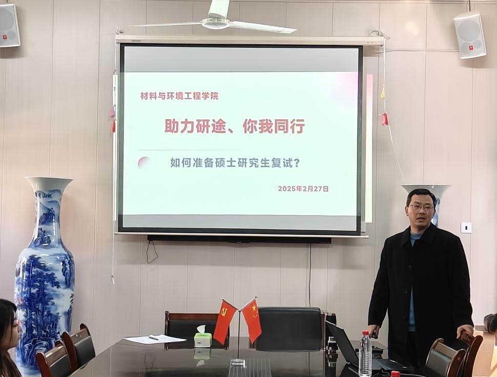 为助力学子们在考研复试中脱颖而出,2月27日下午,材料与环境工程学院于多闻楼410举办考研复试指导会。此次会议邀请了材环院秦飞博士担任主讲人,众多考研学子积极参与。党总支副书记王新辉主持会议。