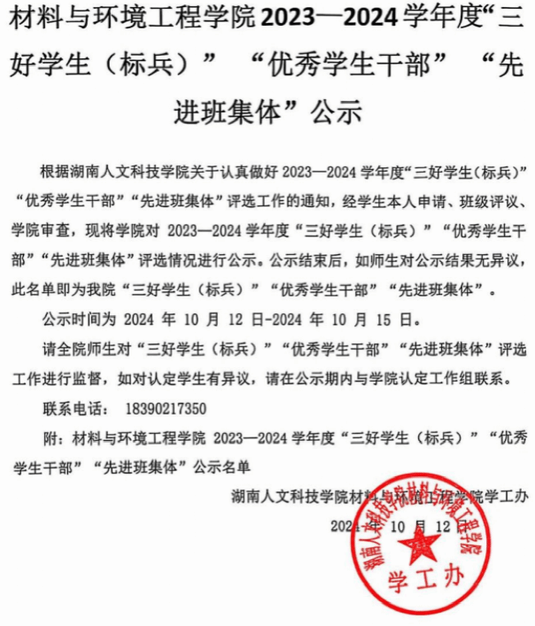 材料与环境工程学院 2023—2024学年度“三好学生标兵” “三好学生” “优秀学生干部”公示名单