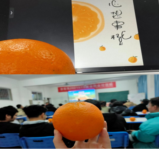 (副书记陈佩君为考研学生送去橙子,寓意心想事“橙”)