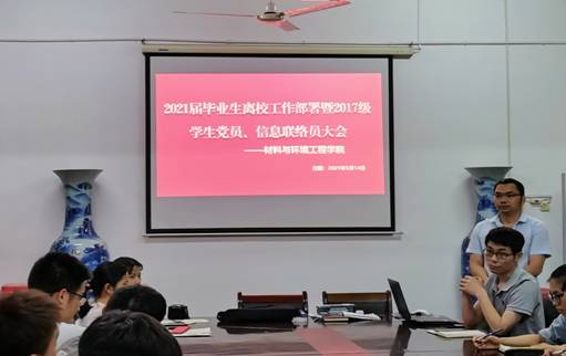 为了组织好毕业生离校前的各项工作,实现完成就业责任目标,确保毕业生顺利离校、平安离校,材料与环境工程学院于2021年5月14日晚19时,在多闻楼410教室组织召开了就业网签与去向登记平台培训会议和2021届毕业生离校工作部署会议以及2017级学生党员、信息联络员大会。出席本次会议的有:副院长谭峰亮、辅导员胡坚以及辅导员陈佩君。