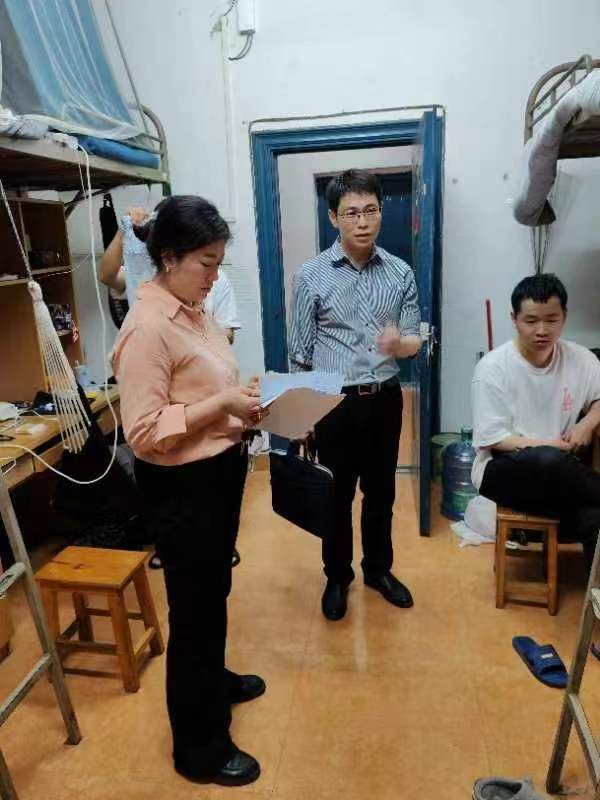 4月26日谭峰亮、陈佩君下寝室关心同学们毕业论文完成情况、就业去向。
