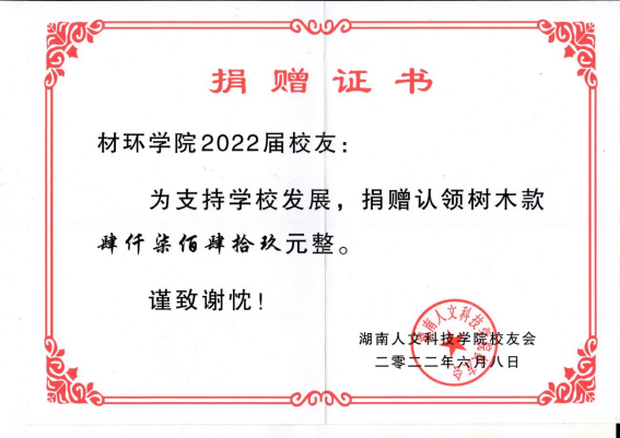 为进一步加强毕业生感恩母校、勇担使命的思想觉悟,深入理解学校文化的精神与内涵,引导毕业生铭志于树,寄情于林,2022年6月,材料与环境工程学院2022届毕业生校友树认捐活动在校友林举行。