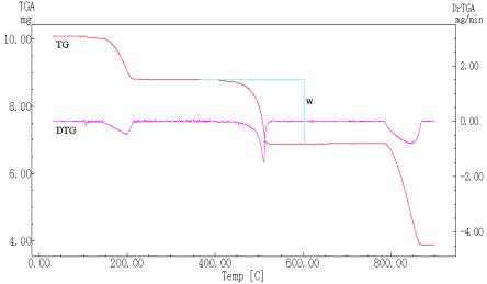 在TG曲线中,如果反应前后均为水平线,表示反应过程中样品重量不变;若曲线发生偏转,则相邻两水平线段之间在纵坐标上的距离所代表的相应重量W即为该步反应的重量差(如图4)。