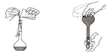 图2-6 转移溶液入容量瓶 图2-7 混均操作