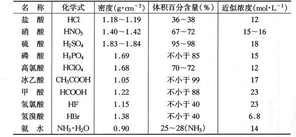 附录4 常用酸碱试剂的密度、含量和近似浓度