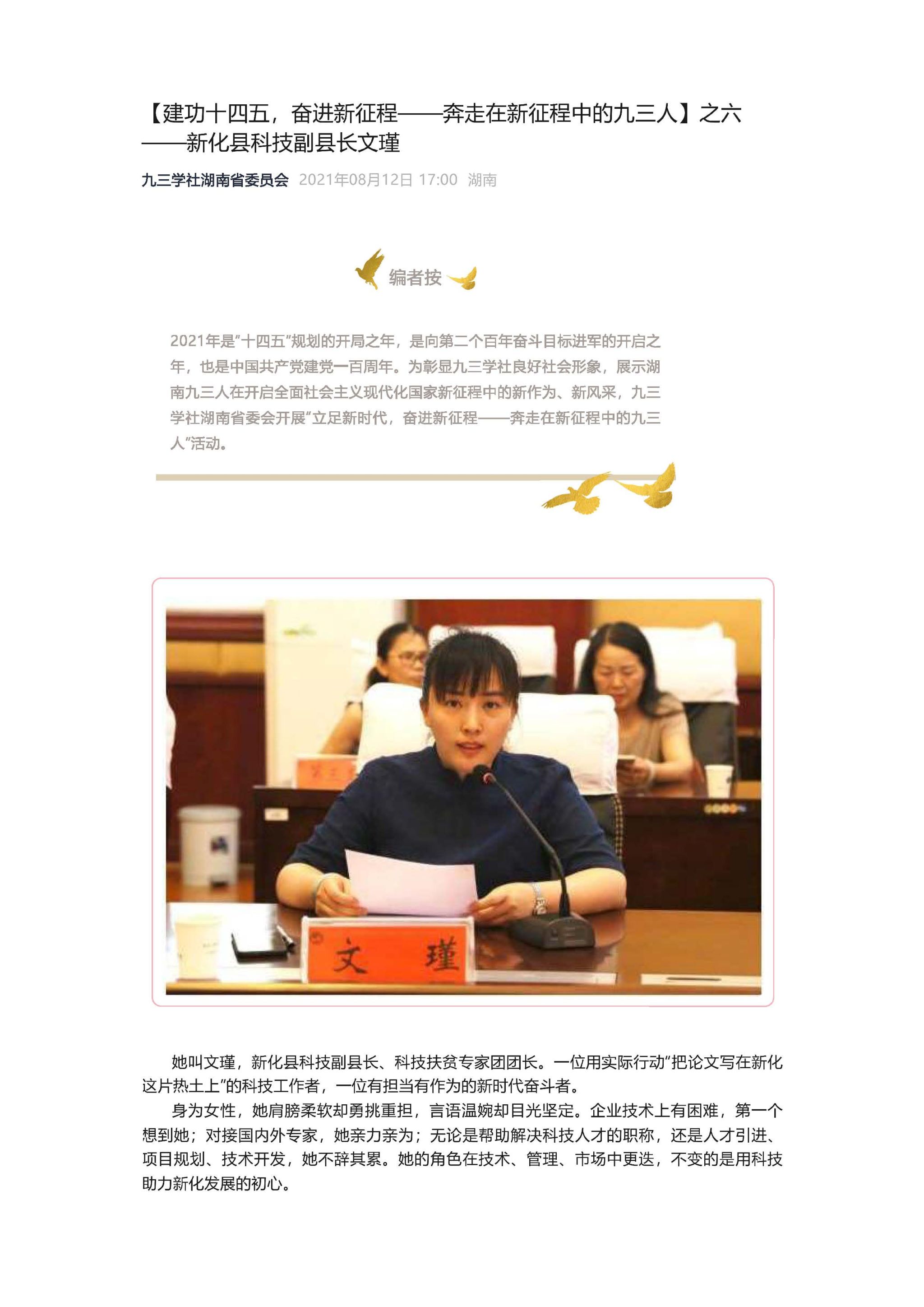 【建功十四五,奋进新征程——奔走在新征程中的九三人】之六——新化县科技副县长文瑾