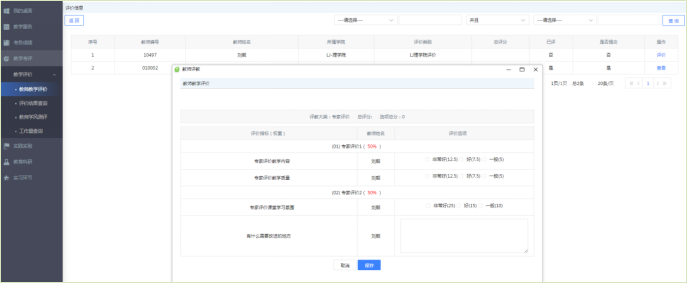 步骤3. 点击课程后的【评价】按钮,进入教师评教页面,对所有指标选项进行评价,并点击【保存】或【提交】按钮即可完成教学评价。