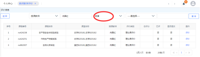 注意:上图中,评教查询对象时,选择查询条件时,若只用一个条件,后面的选项应改为上图红圈中所示为“或者”,否则可能不能显示查询结果。