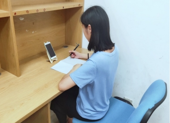 (一)监考教师需核查考生是否全部开启直播、开启语音。检查考生是否将考试设备放在视频范围内,监控设备是否调整到位,是否将摄像头对准上半身和桌面答题区域。桌面只允许摆放接收试卷的手机、空白答题纸、空白草稿纸、笔及必要的答题文具。参考图像如下: