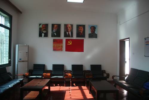 明亮洁净的党员活动室里,悬挂着“马恩列斯毛”共产主义五大人物的照片,鲜红的党旗下整齐的摆放着会议学习桌椅。室内开辟了“党的基本制度”、“公示栏”、“支部荣誉”等专栏,涵盖入党誓词、党组织情况、学习制度、党务公开等内容,让人一目了然。