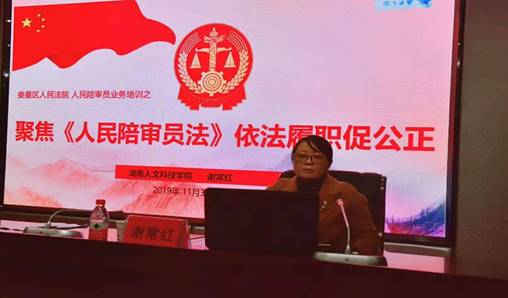 11月30日上午,娄底市娄星区人民法院组织2019年度初任人民陪审员任前培训,我院副教授谢常红老师应邀授课,来自全区149名初任人民陪审员参加了本次培训。