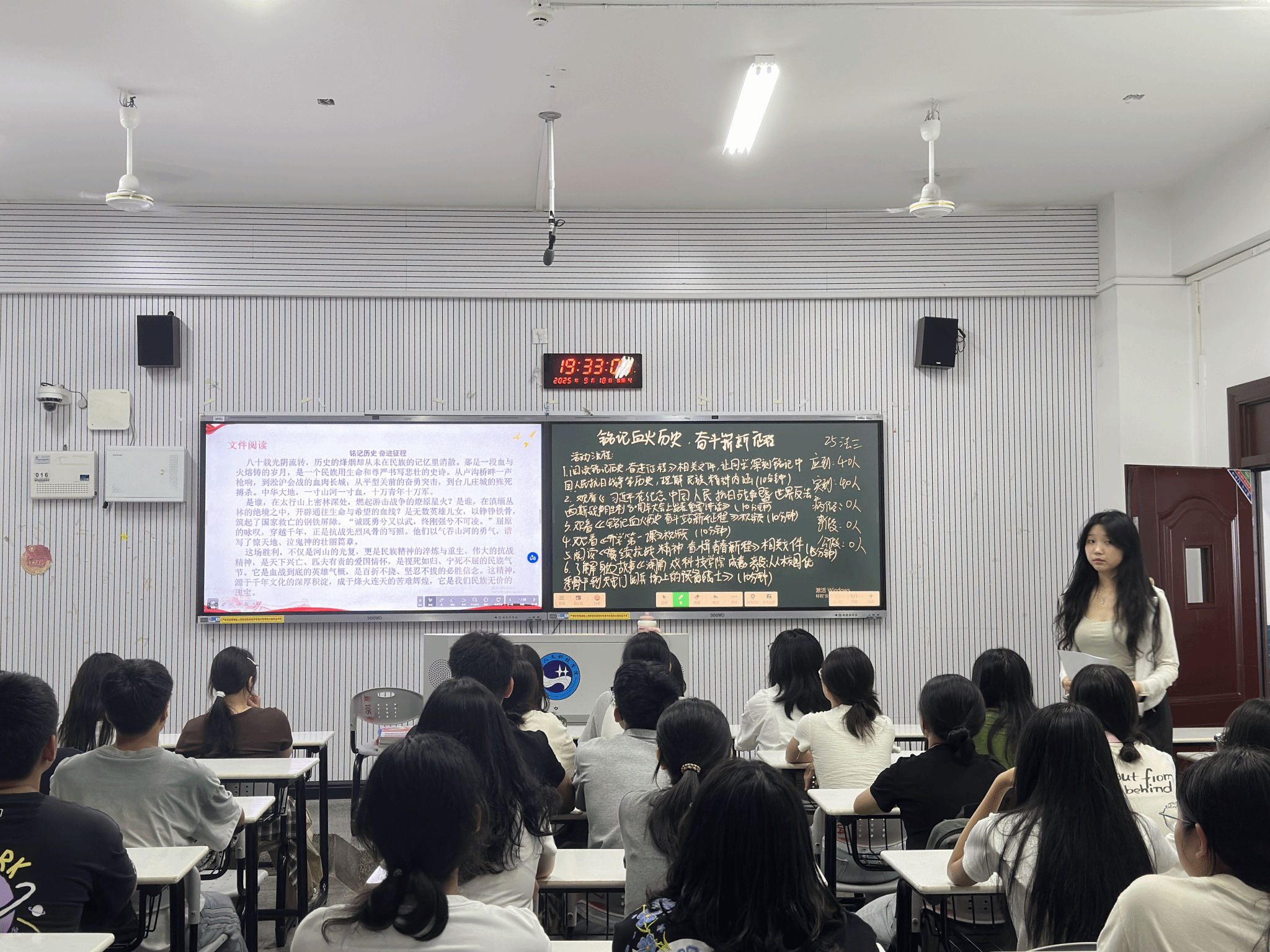 首先,同学们阅读了《人铭记历史 奋进征程》相关文件,增强了将爱国情、强国志融入学业与实践的行动自觉。随后,全体同学观看了《习近平在纪念中国人民抗日战争暨世界反法西斯战争胜利80周年大会上发表重要讲话》视频和《铭记血火历史 奋斗站新征程》视频,同学们借助影像画面,更直观地感受历史细节与革命先辈的奋斗精神,进一步坚定了正确的历史观与和平理念。通过了解身边榜样——beat365中文官方网站成嘉朋同学“从校园优秀骨干到天安门阅兵场上的预备役战士”的成长故事,进一步激发了大家的爱国情怀与报国之志。最后,组织观看了《校园安全》视频与湖南省思政公开课,增强了同学们维护国家及校园安全稳定的意识,为促进全面发展和健康成长、更好地贡献社会筑牢思想与安全根基。