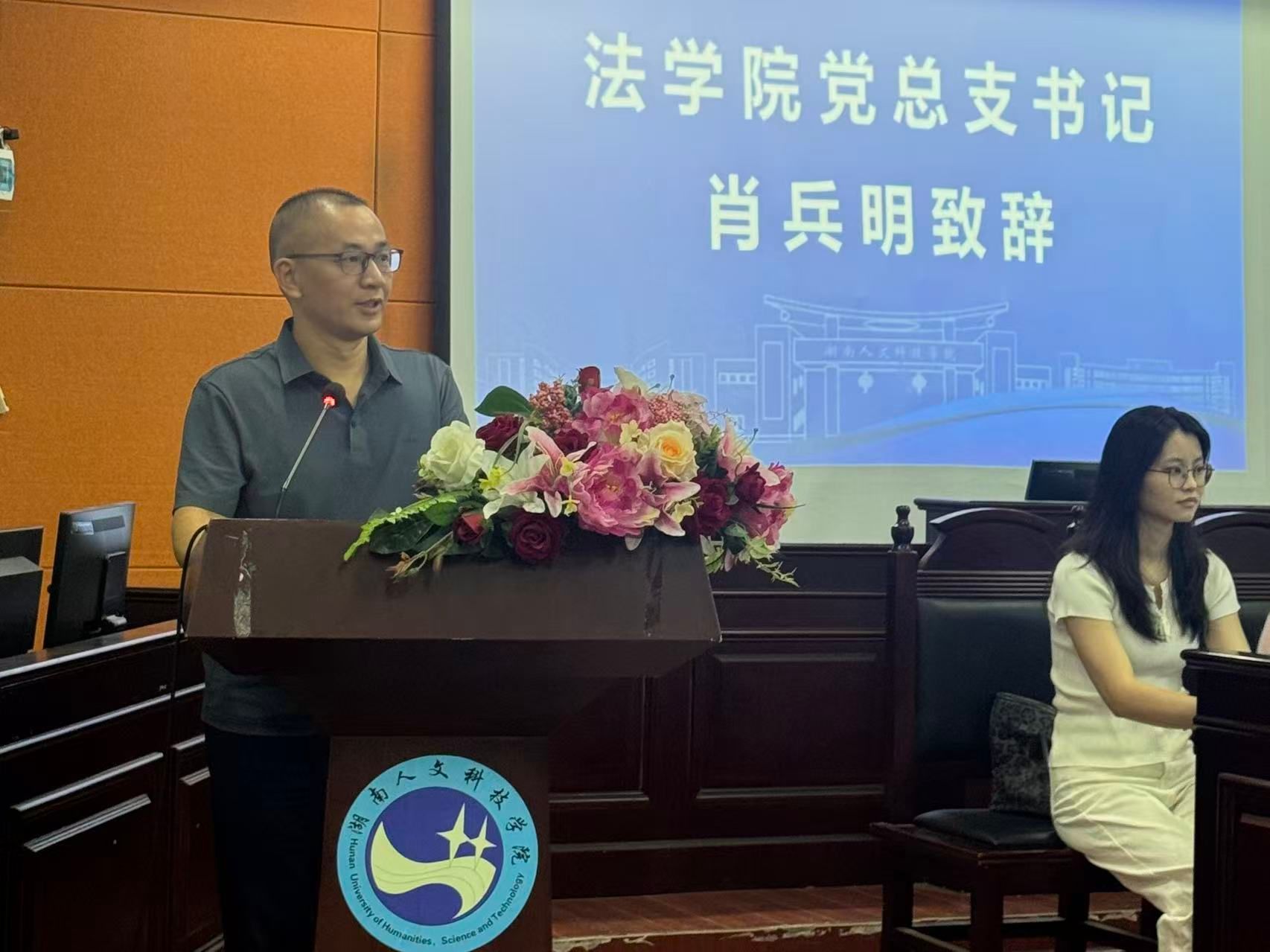 法学院党总支书记肖兵明致辞,代表学院向全体新生表示热烈欢迎。他简要介绍了法学院的发展历程与育人理念,勉励同学们在大学的广阔平台中汲取知识、锻炼能力、早日起航,奔赴属于自己的精彩未来。他还特别叮嘱同学们要注重身心健康,保持张弛有度的生活节奏,通过体育锻炼磨砺意志,以饱满的精神状态面对大学生活中的各项挑战。