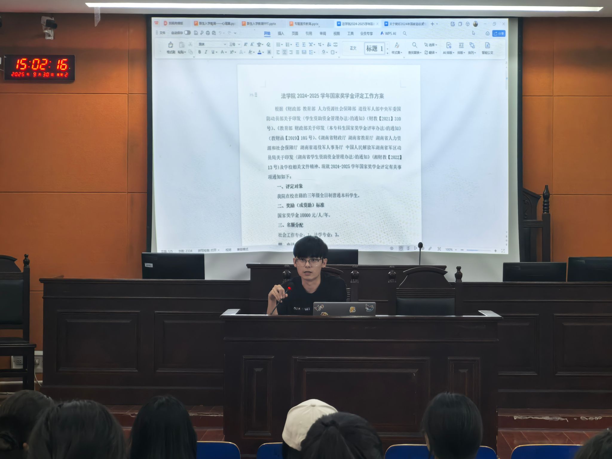 辅导员羊哲思首先围绕奖助学金评定与家庭经济困难学生认定两项内容展开介绍。他结合具体案例与政策条文,解读了学校在学业激励与助学保障方面的相关制度,帮助新生全面了解申请条件与流程,为同学们提供了清晰指引。