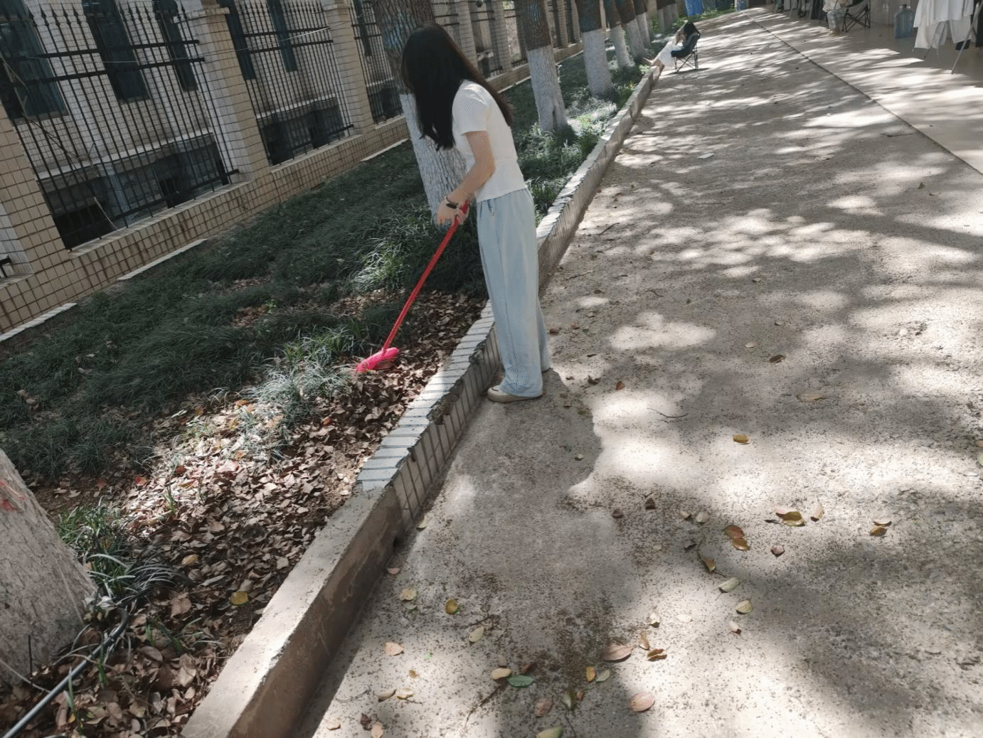 活动开始后,大家分工明确、配合默契,手持扫帚、垃圾钳等工具,对道路上散落的枯枝落叶进行清扫,对草坪间被随意丢弃的垃圾进行捡拾。经过十多分钟的共同努力,6、7栋宿舍周边道路焕然一新,草坪也恢复了整洁面貌。