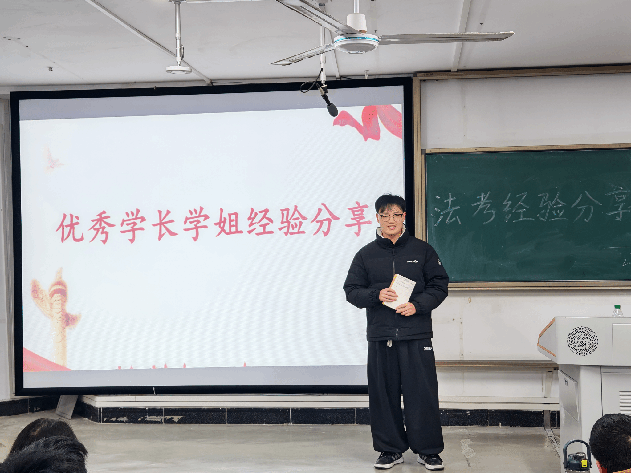 2022级三位高分通过法考的学长学姐——雷佳豪、刘燕南、曾宋庆受邀分享宝贵经验。雷佳豪强调备考中理解性阅读、重点记录与反复刷题的重要性;刘燕南围绕心态调整、资料选择与实用工具展开分享,并提醒同学们注意劳逸结合;曾宋庆建议尽早启动备考计划,遵循“学习—练习—总结”的闭环学习模式,打牢基础、吃透真题。在互动环节,同学们积极提问,三位分享人一一细致地解答了关于时间规划、网课选择、难点突破等方面的问题。