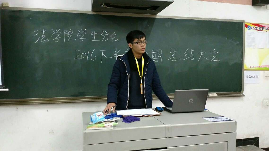2016年12月28日18:30,法学院学生分会2016下半年学期总结大会在致远楼306举行。此次会议由秘书处干事颜佳丽主持,参加会议的有辅导员谢琼老师,主席覃明喜学长、吴佳锌学姐以及分会全体成员。
