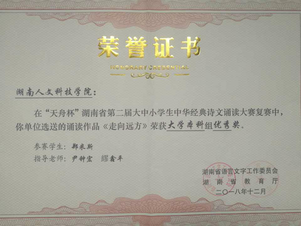 2018年12月,我院郑米斯同学参加了由湖南省语言文字工作委员会和湖南省教育厅共同主办的“天舟杯”湖南省第二届大中小学生中华经典诗文诵读大赛,并在复赛中获得大学本科组优秀奖。