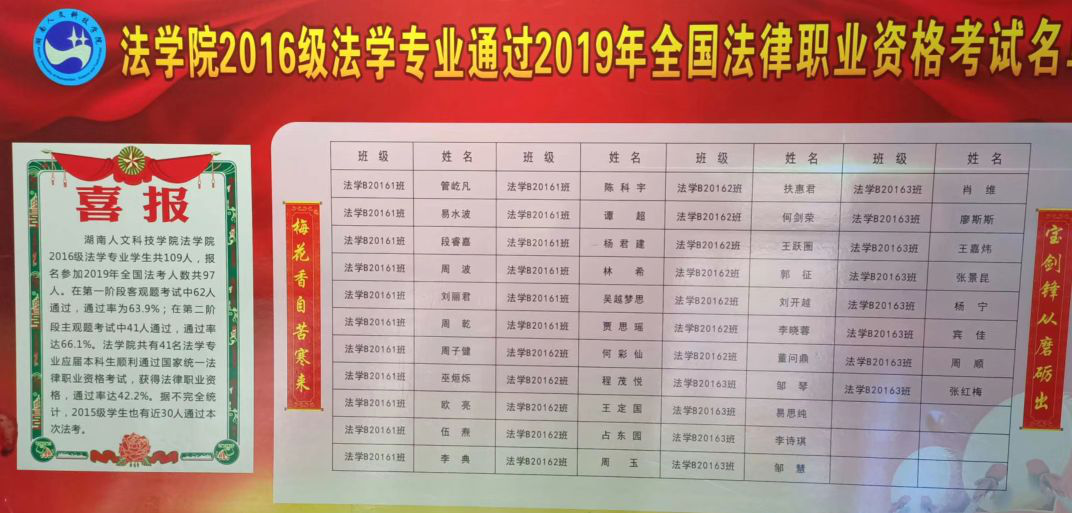 学院坚持以人为本的办学理念,以创新为动力,追求卓越,教育教学工作成绩突出。法学专业参加湖南省历届模拟法庭大赛均获奖,其中2015年获团体二等奖及优秀组织奖。2017荣获首届“龙图杯”全国高校法庭辩论赛全国第六名。15级学生余奎林、吴美芳和任烁璇的竞赛创业项目“鹅友圈”在2018“创青春”浙江大学双创杯全国大学生创业大赛中荣获银奖。我院就业服务工作坚持以市场为导向,建立了若干稳定的就业基地,把“三考”(研考、法考、公务员考)和自主创业作为就业工作的重头戏。学院考研风气浓厚,毕业生考研通过率最高达29.60%,其中法学院2018年同一寝室考取五名硕士研究生,时称“五朵金花”;参加选调生、村官和公务员考的初次通过率最高达37.22%;近年来法律职业资格考试通过率年年攀升,远超国家通过率。2019年国家统一法律职业资格考试,16级法学专业生共有97人报名参加,41名法学专业应届本科生顺利通过考试,获得法律职业资格,通过率达42.2%,远超国家平均通过率近30多个百分点。