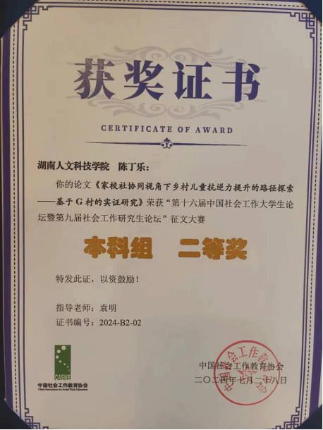 由中国社会工作教育协会主办、成都信息工程大学承办的 “中国式现代化新进程中我国社会工作的发展与创新——第十六届中国社会工作大学生论坛暨第九届社会工作研究生论坛”在成都隆重举行。此次论坛汇聚了来自北京大学、复旦大学、中国社会科学院大学等183 所高校的 510 余名本硕博社会工作专业的优秀学子,共同探讨社会工作在中国式现代化新进程中的发展与创新之路。beat365社会工作专业学生陈丁乐、廖志宏同学的两项作品在众多优秀作品中成功突围。其中陈丁乐的《家校社协同视角下乡村儿童抗逆力提升的路径探索——基于G村的实证研究》论文,荣获本科组二等奖,并受邀在大会上进行主题发言。