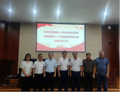 8月6日,法学院朱耀斌院长、副院长唐全民、付盾及法学教研室主任谢常红、教务秘书黄廖明一行到访邵阳学院法商学院交流学习。邵阳学院法商学院院长郑爱民、副院长王周火、法学专业教研室主任何赛强、综合办公室主任伍灵芝热情接待了朱院长一行,双方就地方本科院校法学人才培养等举行了交流会议。