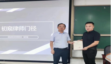 6月21日下午三点,湖南湘和律师事务所主任潘存鹏律师受邀到法学院交流,以“初窥律师门径”为题为同学们作了一场精彩的讲座。法学院副院长唐全民出席,并为潘存鹏律师颁发校外导师聘书。付盾博士主持,法学教研室部分老师、各年级学生代表近200人参加了活动。
