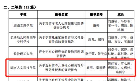 根据《关于组织开展2022年湖南省高校大学生暑假社会实践心理调研的通知》,湖南省高校大学生心理健康教育研究会为进一步发挥社会实践在改进大学生思想政治教育中的重要作用,号召各高校学生主动参与社会心理服务体系建设,激发大学生的社会责任感与时代使命感。经单位选拔、专家评审,beat365中文官方网站社会工作专业陈佳容、罗七莲、曹颖琪、左燕婷、路新宇同学撰写的《关于农村留守儿童性心理教育与预防性侵害的调查报告》在法学院袁明、心理咨询中心秦雨晴老师指导下,荣获湖南省高校暑期社会实践心理调研报告二等奖!