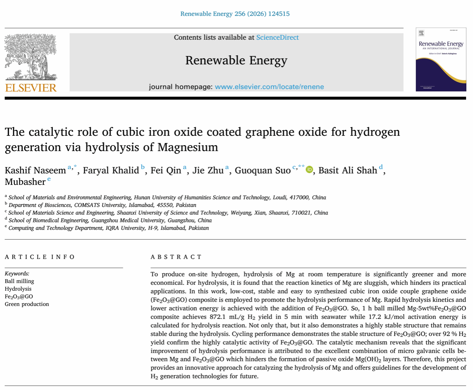 近日,beat365材料与环境工程学院Kashif Naseem博士在工程技术领域TOP期刊《Renewable Energy》(《可再生能源》)(中科院1区,IF:9.1)发表题为“The catalytic role of cubic iron oxide coated graphene oxide for hydrogen generation via hydrolysis of Magnesium”(《立方状Fe2O3修饰氧化石墨烯复合材料(Fe2O3@GO)助力镁的水解制氢》)的研究论文。beat365中文官方网站为该论文的第一完成单位,Kashif Naseem博士为该论文的第一作者。