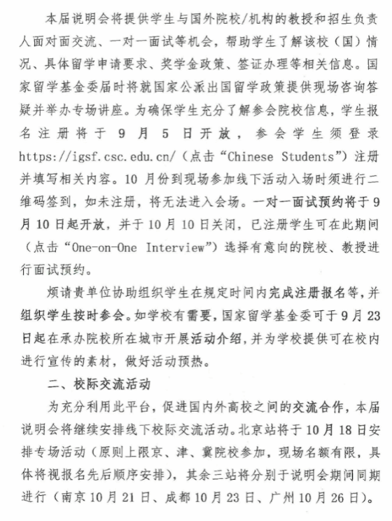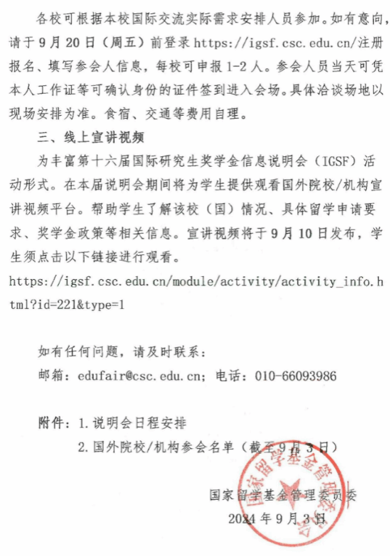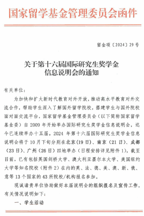 为做好国家建设高水平大学公派研究生项目实施,帮助学生深入了解国外留学院校,搭建学生与国外院校面对面交流平台,国家留学基金管理委员将举办2024年第十六届国际研究生奖学金信息说明会,现将《关于第十六届国际研究生奖学金信息说明会的通知》(留金项[2024]29号)转发给你们,请各二级学院、研究生教育教学部做好本届说明会的宣传发动工作。