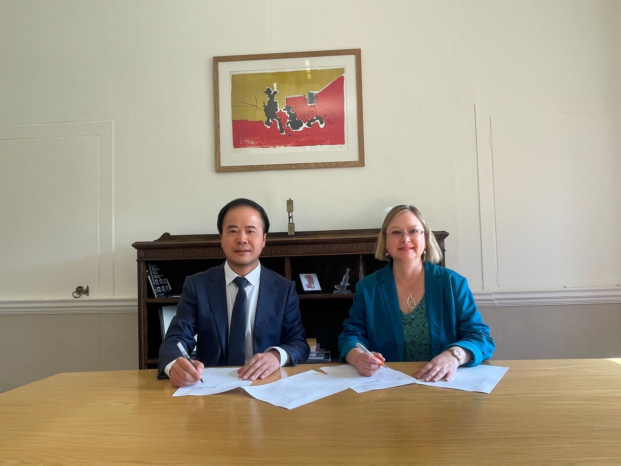 在巴斯斯巴大学,代表团与学校校长Georgina Andrews、副校长Simon Haslett、副校长John Strachan以及国际招生与合作部、教育学院负责人等举行会谈。座谈会上,英方校领导表达了对学校代表团一行到访的热烈欢迎,详细介绍了巴斯斯巴大学的情况,着重强调了学校在教育和人文领域的深厚底蕴,并对两校合作办学项目的深化表达了诚挚的意愿。盛明科向英方介绍了学校在联合培养项目方面的教育教学、实践实习、招生就业等方面的创新与改革。双方还交流了两校合作项目10年的主要成果,围绕中英合作办学项目的学生交流、课程建设、科研合作、数字教育、文化交流等主题展开深入探讨,就中英合作办学项目的具体实施、促进双方教学资源的共享、未来十年的合作进行系统谋划,达成多项共识。会上,两校签署了新的合作办学协议。