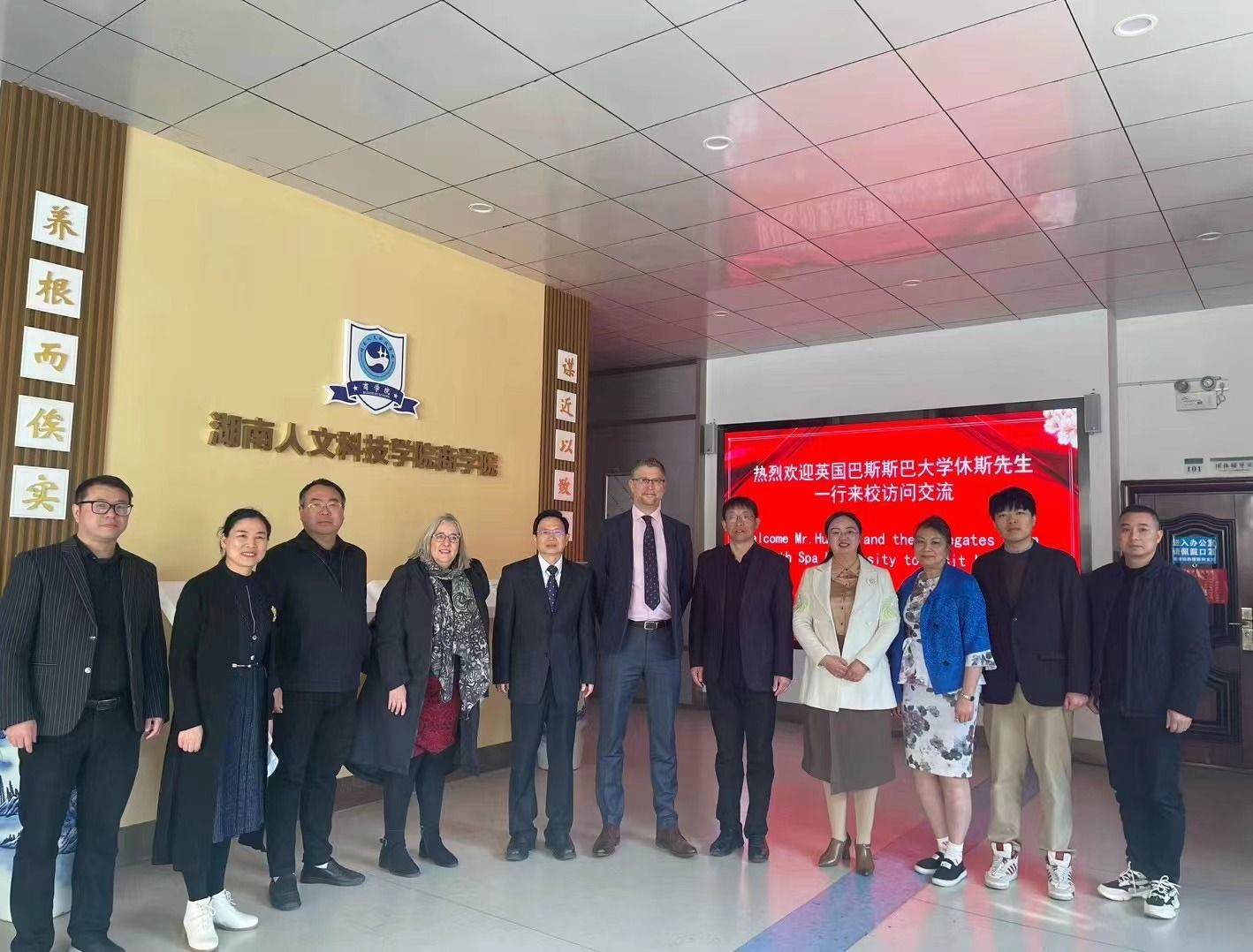 On Nov. 27, 2023, a delegation from Bath Spa University (BSU) in the UK visited HUHST for academic exchange. The delegation comprised Benjamin Samuel Hughes (Deputy Pro Vice-Chancellor of BSU), Polly Loveday Derbyshire (Dean of the School of Business), Jiemin Tomita (Director of International Enrollment and Cooperation Department), and Huang Zichen from its China office. They were warmly welcomed by Prof. Chen Zhiguo, Member of CPC Committee and Vice President of HUHST. A discussion and exchange session took place at the School of Business, which was also attended by Huang Min (Director of the International Cooperation and Exchange Office), leaders from the School of Business, and other representatives. Following the meeting, Benjamin delivered a presentation for and exchanged views with students and faculty from the School of Education on the Early Childhood Education program (a cooperative education program). Besides, Polly conducted an open class for students and faculty from the School of Business.