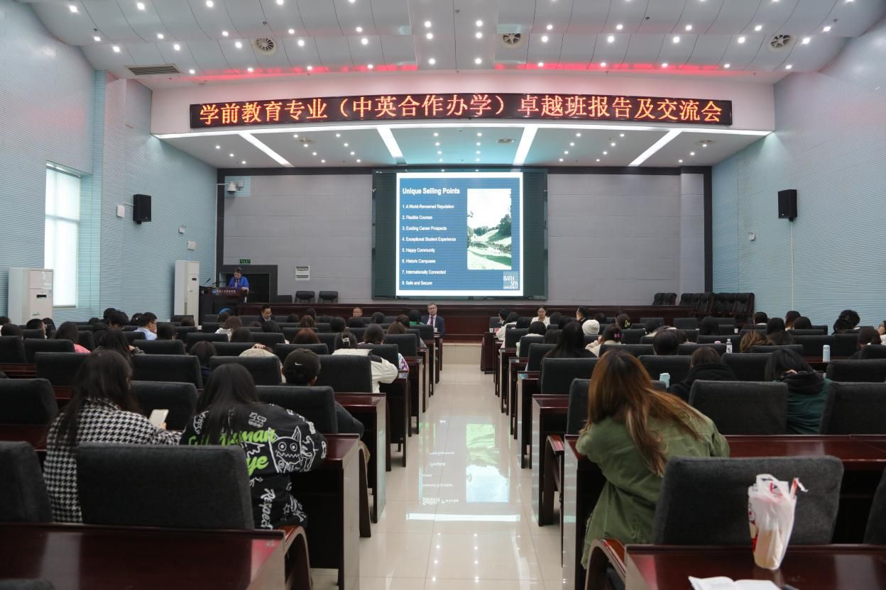 Benjamin later visited No. 2 Lecture Hall of HUHST to attend an exchange meeting for the Early Childhood Education program (cooperative education program). Jiemin Tomita and Prof. Chen Zhiguo also attended the meeting. Other participants included Director Huang Min, leaders and other staff representatives from the School of Education, and students from the 2021, 2022, and 2023 Excellence Classes. Benjamin mainly introduced BSU's teaching philosophy and culture, as well as the benefits of studying abroad. Finally, he provided detailed answers to students' concerns about academic planning, language barriers, and other issues.