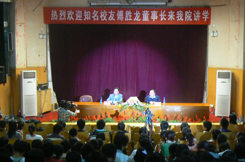 傅胜龙先生以“校友、男人、总裁”3个具有代表性的词语,开始了他的演讲。他说:作为一校友,今年是母校建校三十周年,他用“三十年,一百分”六个字表达出自己对母校的无限眷恋和诚挚赞美,傅胜龙先生满脸笑意地回忆了当年艰苦却充实的求学岁月,对比今天的教学环境,他由衷感叹“今天的校友很幸福”,并希望大家珍惜这来之不易的学习机会;作为一名男人,他提出“珍爱家庭,关爱女性”,傅总公司里有不成文的规定:“离开老婆即离开公司”。他要求员工不得为富不仁,嫌弃家庭,因为“不能对家庭负责的人,不会对企业负责,更不可能对社会负责”;作为一名总裁,一个成功的企业家,在企业他倡导“资本=责任、业绩=财富”的核心价值观,用政治先进性来打造企业核心竞争能力。他建议各学员关心时事政治,把握时代脉搏,发挥自身优势,积极努力适应社会。